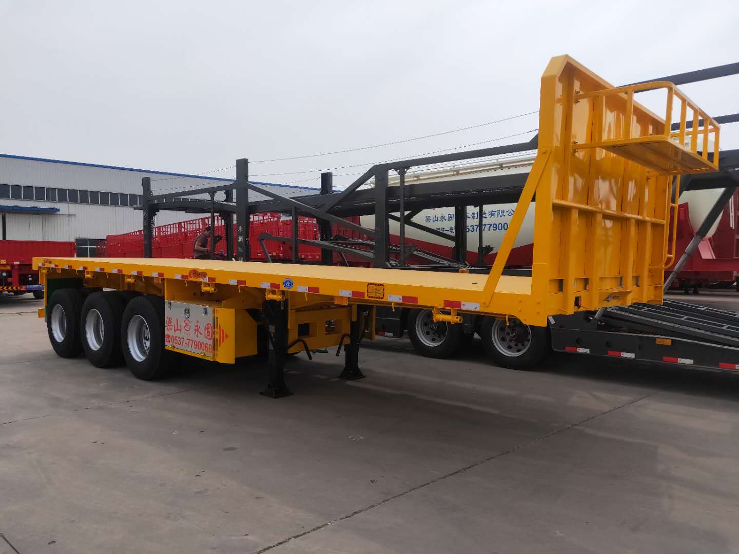 低平板半挂车主要类型有:两轴高低高低平板半挂车,两线四轴高低高低平板半挂车,三轴高低高低平板半挂车,三线六轴高低高低平板半挂车。低平板载重根据轴数,轮胎的大小,低平板半挂车的载重也是不同的,轴数越多,载重越大,载重范围在20-一百五十吨之间。根据轴数,轮胎的大小,低平板半挂车的载重也是不同的,轴数越多,载重越大,载重范围在20-一百五十吨之间。